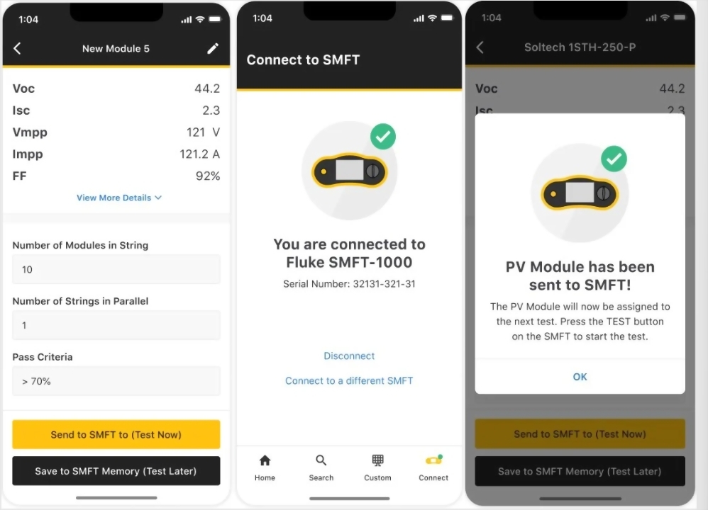 Fluke TruTest™ 太陽能資料庫應用程式專為與 SMFT-1000 多功能光伏測試儀無縫協作而設計,使測試更輕鬆、更有效率。這款應用程式具有豐富的光伏電池板資料庫,支援將電池板規格直接導入分析儀,無論您身在何處,均可存取120,000 多種不同類型的光伏電池板,而無需手動輸入,可顯著簡化測試流程。