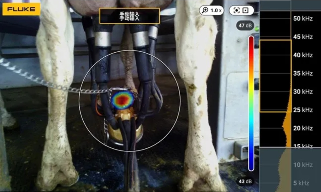 在現場使用聲學成像儀對轉盤式擠乳設備的各個部位進行排查,尤其是容易發生氣體洩漏和鬆脫的奶杯、連接器、接頭等部位。 ii500C/905C/915C聲學成像儀可以在螢幕上快速且清楚地標記出氣體洩漏的部位,為後續處理提供關鍵資訊。