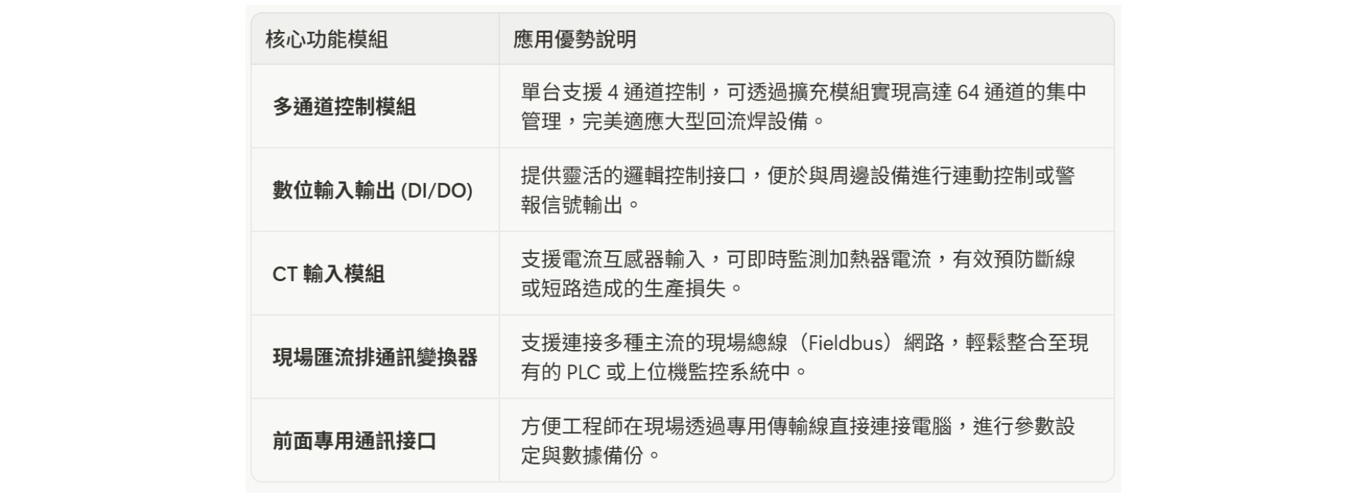 更重要的是,SRZ 控制器單台設備即可實現高達 4 個通道的溫度控制。這意味著在相同的空間內,您可以監控與調節更多的加熱區域。對於回流焊設備而言,這種高密度的通道配置能夠精準對應預熱區、恆溫區與回流區等多個關鍵節點,從而構築出節省空間的多點溫度控制系統,顯著提升設備的整體空間利用率。